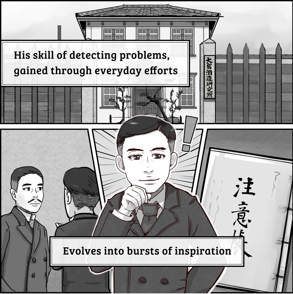 All the while, Tsunekichi continued to manage his sake business with focus and diligence. He was determined to somehow solve the frequent sake spoilage problem, and was eager to stabilize the brewing process in order to produce high quality sake that outperforms those made in rivaling regions. After countless trials and errors, bitter experiences, and more hours of critical thinking, he was finally blessed by a sudden burst of inspiration.